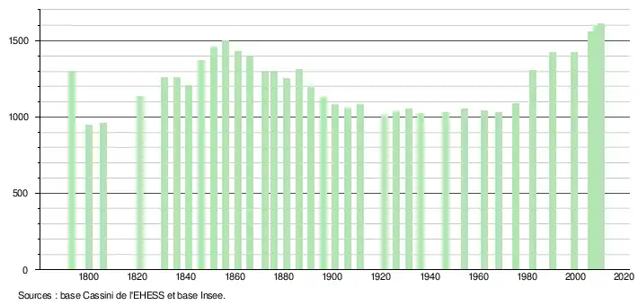 L'évolution du nombre d'habitants est connue à travers les recensements de la population effectués dans la commune depuis 1793. À partir du , les populations légales des communes sont publiées annuellement dans le cadre d'un recensement qui repose désormais sur une collecte d'information annuelle, concernant successivement tous les territoires communaux au cours d'une période de cinq ans. Pour les communes de moins de 10 000 habitants, une enquête de recensement portant sur toute la population est réalisée tous les cinq ans, les populations légales des années intermédiaires étant quant à elles estimées par interpolation ou extrapolation[29]. Pour la commune, le premier recensement exhaustif entrant dans le cadre du nouveau dispositif a été réalisé en [30],[Note 2].