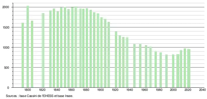 L'évolution du nombre d'habitants est connue à travers les recensements de la population effectués dans la commune depuis 1793. Pour les communes de moins de 10 000 habitants, une enquête de recensement portant sur toute la population est réalisée tous les cinq ans, les populations légales des années intermédiaires étant quant à elles estimées par interpolation ou extrapolation[17]. Pour la commune, le premier recensement exhaustif entrant dans le cadre du nouveau dispositif a été réalisé en 2005[18].