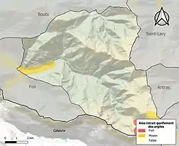 La commune est vulnérable au risque de mouvements de terrains constitué principalement du retrait-gonflement des sols argileux[39]. Cet aléa est susceptible d'engendrer des dommages importants aux bâtiments en cas d’alternance de périodes de sécheresse et de pluie. 5,6 % de la superficie communale est en aléa moyen ou fort (88,8 % au niveau départemental et 48,5 % au niveau national). Sur les 207 bâtiments dénombrés sur la commune en 2019, 14 sont en aléa moyen ou fort, soit 7 %, à comparer aux 98 % au niveau départemental et 54 % au niveau national. Une cartographie de l'exposition du territoire national au retrait gonflement des sols argileux est disponible sur le site du BRGM[40],[Carte 3].