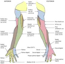 - Des rameaux digitaux pour la face dorsale des trois premiers doigts et la moitié du quatrième (à l'exception de la dernière phalange).
