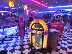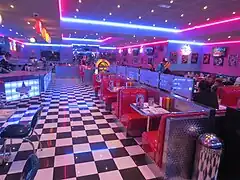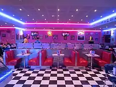Le décor « Memphis » est inspiré de l'ambiance et du design vintage rétro custom Hot rod US , avec carrelages à damier (en), mobilier à base d'inox / chrome, banquettes en skaï pailleté bleu ou rouge, juke-box, photos de pin-up et d'icônes américaines dont Elvis Presley, Marilyn Monroe, James Dean ou Humphrey Bogart, enseignes lumineuses et éclairage tube néon coloré, anciennes plaques d'immatriculation américaine et plaques émaillées publicitaires, décoration à base de pompes à essence de la route 66, serveurs habillés à la mode de l'époque, ambiance musicale Rock 'n' roll, écrans plats diffusant des scènes et images des états Unis
