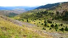 Un des menhirs du site de la Cham des Bondons. À l'arrière-plan, le puech de Mariette. | ||||