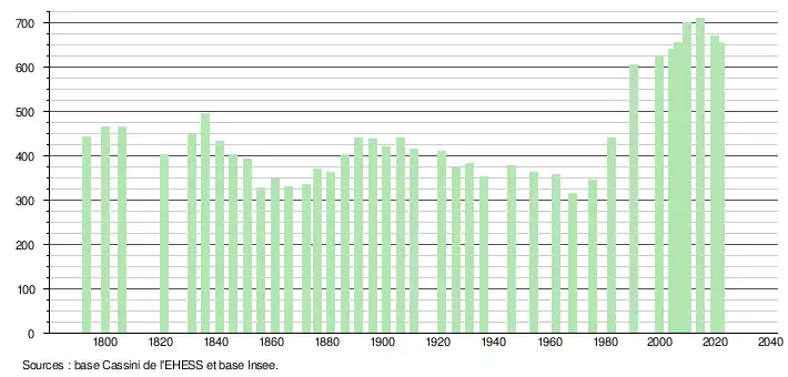 L'évolution du nombre d'habitants est connue à travers les recensements de la population effectués dans la commune depuis 1793. Pour les communes de moins de 10 000 habitants, une enquête de recensement portant sur toute la population est réalisée tous les cinq ans, les populations légales des années intermédiaires étant quant à elles estimées par interpolation ou extrapolation[38]. Pour la commune, le premier recensement exhaustif entrant dans le cadre du nouveau dispositif a été réalisé en 2004[39].