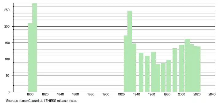 L'évolution du nombre d'habitants est connue à travers les recensements de la population effectués dans la commune depuis 1800. Pour les communes de moins de 10 000 habitants, une enquête de recensement portant sur toute la population est réalisée tous les cinq ans, les populations légales des années intermédiaires étant quant à elles estimées par interpolation ou extrapolation[17]. Pour la commune, le premier recensement exhaustif entrant dans le cadre du nouveau dispositif a été réalisé en 2007[18].