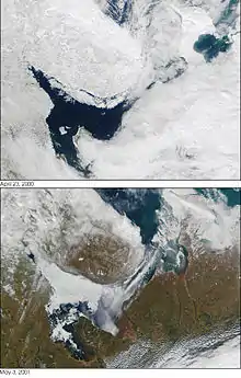 La fonte des neiges commence en avril et les glaces disparaissent en mai. Mais, à cause des vents du nord, on peut rencontrer des « glaçons » flottants jusqu'à fin juin.