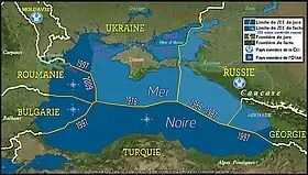 Plus récemment la mer Noire a été une zone de contact entre l'URSS et ses satellites au nord, et la Turquie membre de l'OTAN au sud : le rideau de fer la traversait donc. Aujourd'hui elle se trouve sur les marges les plus orientales de l'Union européenne, face à la CEI et à la Turquie. Les bases militaires de Crimée, stratégiques pour la Russie, sont depuis 2014 sous son administration directe. La péninsule et ses eaux territoriales appartiennent de jure à l'Ukraine, mais de facto à la Russie qui, à travers son contrôle et son occupation de l'est et du sud de l'Ukraine, jusqu'aux abords des bouches du Danube, contrôle de fait l'espace maritime ukrainien[27].