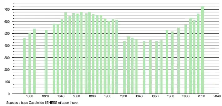 L'évolution du nombre d'habitants est connue à travers les recensements de la population effectués dans la commune depuis 1793. Pour les communes de moins de 10 000 habitants, une enquête de recensement portant sur toute la population est réalisée tous les cinq ans, les populations légales des années intermédiaires étant quant à elles estimées par interpolation ou extrapolation[24]. Pour la commune, le premier recensement exhaustif entrant dans le cadre du nouveau dispositif a été réalisé en 2005[25].