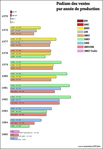 En général, ce sont les modèles diesel qui se vendent le mieux mais les modèles essence ont une embellie lors de la refonte moteur de l'année 1981 et l'apparition du moteur M102, la 230E est même la première vente en 1983 et 1984.