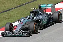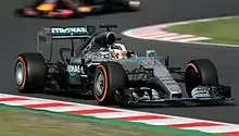 À Singapour, les Mercedes sont battues en qualifications, pour la seule fois de la saison, par la Ferrari de Vettel, ce qui met fin à 23 pole positions consécutives, deuxième plus longue série de la discipline[16]. Elles ne réussissent pas à faire mieux que la troisième ligne. Elles ne progressent pas en course où Hamilton connaît son unique abandon de la saison sur un problème d'accélérateur quand Rosberg termine quatrième. Au Japon, Rosberg part en pole position, comme lors des cinq courses restantes, mais Hamilton s'impose devant lui. En Russie, Rosberg réussit à mieux s'élancer qu'Hamilton mais connaît un problème d'accélérateur et abandonne en début de course, Hamilton s'imposant. À l'occasion de cette épreuve, et comme en 2014, Mercedes remporte son deuxième titre mondial consécutif en Russie, cela alors qu'il reste cette fois quatre Grands Prix.