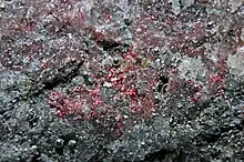 - (fr) échantillon au Musée des Mines de Paris, gouttelettes de Hg natif nichées dans le cinabre rouge