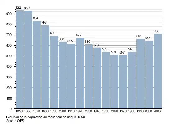 Le graphique suivant résume l'évolution de la population de Merishausen entre 1850 et 2008[3] :