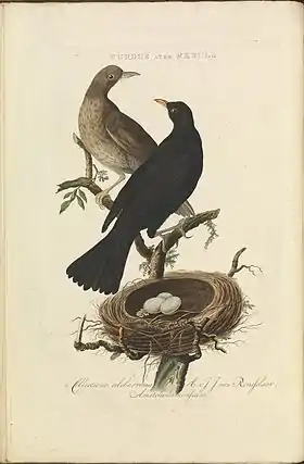Le très commun Merle noir est naturellement recensé par Carl von Linné dès 1746 dans son ouvrage sur la faune de Suède, Fauna Svecica. Il y est répertorié sous l'appellation Turdus ater, rostro palpebrisque fulvis[37] qui signifie « grive noire, au bec et aux paupières jaunes ». Il est d'ores et déjà regroupé avec les grives dans le genre Turdus, conformément à cet égard au sens de son nom en suédois koltrast, la « grive de charbon ».