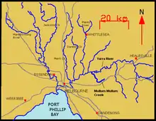 Le cours d'eau, qui traverse la banlieue nord de la ville de Melbourne, prend sa source près de Wallan au nord de Melbourne et s'écoule vers le sud sur 70 km pour rejoindre le fleuve Yarra à Dights Falls.