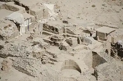 Le sommet des buttes de lœss avait été occupé par trois monastères bouddhiques, qui servaient de lieux de culte et de résidence aux moines, et par deux ensembles cultuels sans cellules monastiques : des stūpas. Ils semblent avoir été en fonction du IVe au VIe siècle[7].