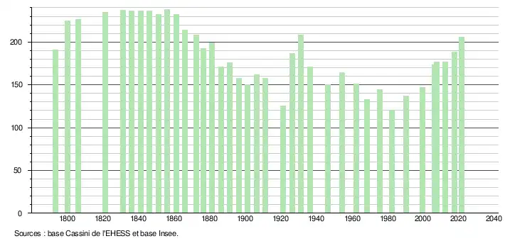 L'évolution du nombre d'habitants est connue à travers les recensements de la population effectués dans la commune depuis 1793. Pour les communes de moins de 10 000 habitants, une enquête de recensement portant sur toute la population est réalisée tous les cinq ans, les populations légales des années intermédiaires étant quant à elles estimées par interpolation ou extrapolation[21]. Pour la commune, le premier recensement exhaustif entrant dans le cadre du nouveau dispositif a été réalisé en 2007[22].
