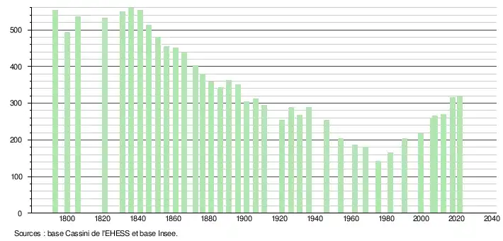L'évolution du nombre d'habitants est connue à travers les recensements de la population effectués dans la commune depuis 1793. Pour les communes de moins de 10 000 habitants, une enquête de recensement portant sur toute la population est réalisée tous les cinq ans, les populations légales des années intermédiaires étant quant à elles estimées par interpolation ou extrapolation[23]. Pour la commune, le premier recensement exhaustif entrant dans le cadre du nouveau dispositif a été réalisé en 2007[24].