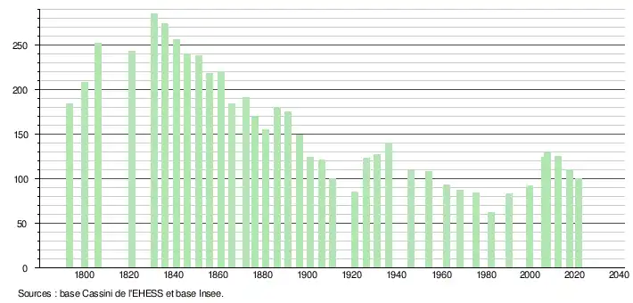 L'évolution du nombre d'habitants est connue à travers les recensements de la population effectués dans la commune depuis 1793. Pour les communes de moins de 10 000 habitants, une enquête de recensement portant sur toute la population est réalisée tous les cinq ans, les populations légales des années intermédiaires étant quant à elles estimées par interpolation ou extrapolation[20]. Pour la commune, le premier recensement exhaustif entrant dans le cadre du nouveau dispositif a été réalisé en 2007[21].