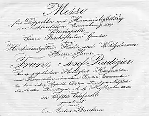 Traduction : La Messe en mi mineur … est une composition sans parallèle dans la musique d'église des 19e et 20e siècles. … Tandis que l'évêque Rudigier posait la première pierre d'une cathédrale, Bruckner commençait aussi à construire une cathédrale, une cathédrale musicale[5].