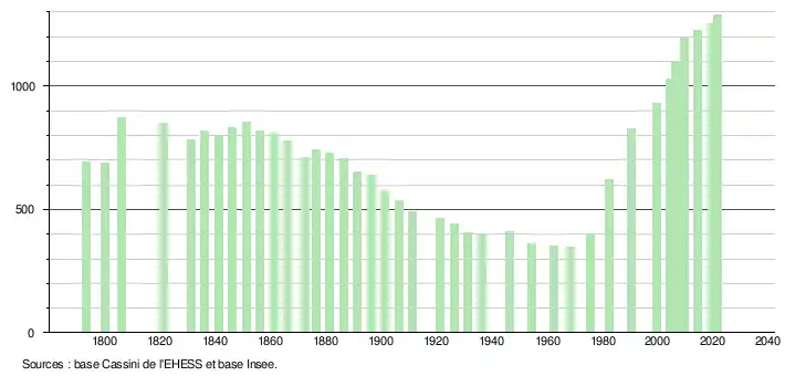 L'évolution du nombre d'habitants est connue à travers les recensements de la population effectués dans la commune depuis 1793. Pour les communes de moins de 10 000 habitants, une enquête de recensement portant sur toute la population est réalisée tous les cinq ans, les populations légales des années intermédiaires étant quant à elles estimées par interpolation ou extrapolation[19]. Pour la commune, le premier recensement exhaustif entrant dans le cadre du nouveau dispositif a été réalisé en 2004[20].