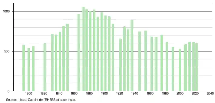 L'évolution du nombre d'habitants est connue à travers les recensements de la population effectués dans la commune depuis 1793. Pour les communes de moins de 10 000 habitants, une enquête de recensement portant sur toute la population est réalisée tous les cinq ans, les populations légales des années intermédiaires étant quant à elles estimées par interpolation ou extrapolation[29]. Pour la commune, le premier recensement exhaustif entrant dans le cadre du nouveau dispositif a été réalisé en 2007[30].