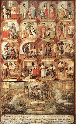 Durant la période coloniale, les Espagnols ont développé un ensemble complexe de termes raciaux afin de décrire les différences. Bien que cette doctrine ait été conçue comme un « système », souvent appelé sistema de castas ou sociedad de castas, les recherches archivistiques montrent que les étiquettes raciales n’ont pas été fixées tout au long de l'histoire. Les œuvres créées principalement au Mexique au XVIIIe siècle, les « peintures de casta », montrent des groupements de types raciaux dans un ordre hiérarchique, ce qui a influencé la façon dont les chercheurs modernes ont conçu la différence en Amérique espagnole[11].