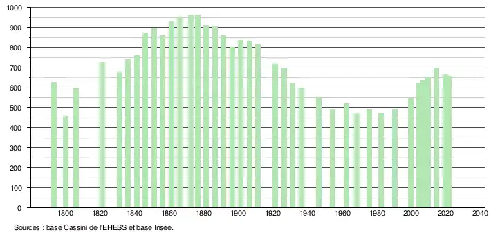 L'évolution du nombre d'habitants est connue à travers les recensements de la population effectués dans la commune depuis 1793. Pour les communes de moins de 10 000 habitants, une enquête de recensement portant sur toute la population est réalisée tous les cinq ans, les populations légales des années intermédiaires étant quant à elles estimées par interpolation ou extrapolation[25]. Pour la commune, le premier recensement exhaustif entrant dans le cadre du nouveau dispositif a été réalisé en 2004[26].
