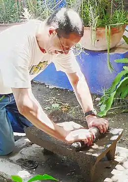 Le metate est une meule dormante de pierre, d’usage domestique, qui sert à moudre le maïs. Utilisée depuis plusieurs milliers d’années (environ 3000 av. J.-C) dans l’aire culturelle de la Mésoamérique, son nom provient du nahuatl « metatl[4] ».
