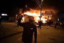 La soirée du est marquée par des heurts entre les forces de l'ordre et les manifestants, réprimés par du gaz lacrymogène et des tirs de balles en caoutchouc[84]. Les émeutes continuent le lendemain, des barricades sont érigées[85] et des incendies et pillages ont lieu[77]. Dans la nuit du 27 au , un homme est tué par balle[86]. Une manifestation est organisée simultanément à Los Angeles. Entre 500 et 1 000 personnes bloquent l'autoroute Interstate 5[87]. Les manifestations de protestation et les émeutes s'étendent ensuite à tout le pays, « de New York à Los Angeles », et le siège de CNN à Atlanta est incendié[88].