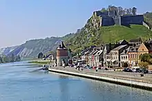 À Dinant se trouve un barrage-écluse. Au sud de Dinant se jette la Lesse au niveau des îles du méandre sud de la ville. On trouve à droite le rocher Bayard qui selon la légende aurait été brisé en deux par un coup de sabot du cheval Bayard. Un peu plus au nord, on trouve sur la rive droite la collégiale et la citadelle de la ville de Dinant, ainsi que la maison d'Adolphe Sax, l'inventeur du saxophone.