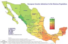 Une publication de 2014 résumant la recherche en génétique des populations au Mexique, y compris trois enquêtes nationales et plusieurs enquêtes régionales spécifiques, a révélé que dans les études réalisées à ce jour, en comptant uniquement les études qui ont examiné l'ascendance des deux parents (ascendance autosomique) : « L'ascendance amérindienne est la plus répandue (51 % à 56 %) dans les trois estimations générales (initialement publiées par l'INMEGEN en 2009), suivie de l'ascendance européenne (40 % à 45 %) ; la part africaine ne représente que 2 % à 5 %. À Mexico, la contribution européenne a été estimée entre 21 % et 32 % dans six des sept rapports, avec la valeur anormale de 57 % obtenue dans un seul échantillon de 19 sujets, bien que ce pourcentage ne puisse pas vraiment être qualifié d'anormal, car il existe des études autosomiques qui obtiennent des pourcentages d'ascendance européenne de 51 %[84], 52 %[14], 70 %[74], et 52 %[85], (la dernière étant pour la région centrale du Mexique dans son ensemble), mais qui n'ont pas été incluses dans cette publication pour des raisons non spécifiées. Selon les études incluses, l'ascendance européenne est la plus répandue dans le nord ( Chihuahua, 50 % ; Sonora, 62 % ; Nuevo León, 55 %), mais dans un échantillon récent de Nuevo León et ailleurs dans le pays, l'ascendance amérindienne est dominante[86].»