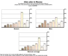Selon le premier recensement racial du Mexique, publié en 1793, la population euro descendante représentait entre 18 % et 22 % de la population (les Mestizos représentant 21 % à 25 % et les Amérindiens 51 % à 61 %)[22]. En 1921, lors du deuxième recensement national prenant en compte la race d'une personne, seuls 9 % de la population s'identifiaient comme étant d'origine européenne, 59 % étant des Mestizos et 29 % des Amérindiens. Pendant longtemps, les résultats du recensement de 1921 ont été considérés comme des faits solides, des publications internationales telles que The World Factbook et Encyclopædia Britannica les ayant utilisés comme référence pour estimer la composition raciale du Mexique jusqu'à aujourd'hui, plus récemment, des universitaires mexicains les ont soumis à un examen minutieux, affirmant qu'une modification aussi radicale des tendances démographiques n'était pas possible et citant, entre autres statistiques, la fréquence relativement faible des mariages entre personnes d'ascendances continentales différentes[23],[3]. Au début des années 1890, des immigrants du nord de l'Italie ont été amenés de la région de Vénétie vers le Mexique pour blanchir la population[24].