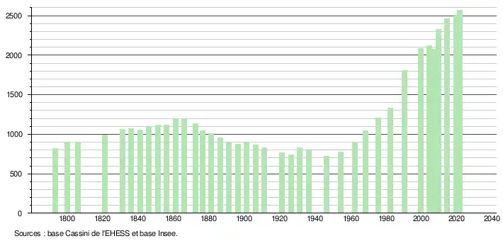 L'évolution du nombre d'habitants est connue à travers les recensements de la population effectués dans la commune depuis 1793. Pour les communes de moins de 10 000 habitants, une enquête de recensement portant sur toute la population est réalisée tous les cinq ans, les populations légales des années intermédiaires étant quant à elles estimées par interpolation ou extrapolation[28]. Pour la commune, le premier recensement exhaustif entrant dans le cadre du nouveau dispositif a été réalisé en 2004[29].