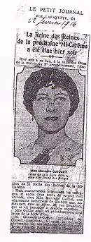 533. La Mi-Carême 1910, La Reine de la Rive gauche, Le Petit Journal, 10 janvier 1910, p.3, 4e colonne. La photo d’Élisa Gaillard, Reine du Temple et celle de Thérèse Choque Reine de la Rive gauche figurent en première page, 1re et 2e colonnes, dans l'article Royautés de Mi-Carême. Voir cet article reproduit sur la base Commons.