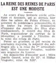 553. La reine des reines de Paris pour 1934 a été élue hier, Le Matin, 5 mars 1934, page 5, 4e colonne. Voir l'article reproduit dans Commons.