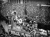 Passage du Char de Paulette Cayet, Reine des Reines de Paris 1928, sur la place de l'Opéra le jeudi de la Mi-Carême 15 mars 1928.