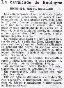 Compte-rendu de l'élection de la Reine des Reines des 6000 blanchisseuses de Boulogne-sur-Seine en mai 1913[34].