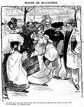 Au moins dès le XVIIIe siècle la Mi-Carême parisienne se présente à nous comme une immense fête féminine et populaire, dont les premières héroïnes sont les blanchisseuses. À Paris « Mi-Carême » et « fête des blanchisseuses » à un moment-donné deviennent synonymes. Et le restent bien après que les blanchisseuses ont cessé d'être les héroïnes officielles de la Mi-Carême[27]. Le défilé des reines sur les grands boulevards, puis le cortège de la Reine des Reines à partir de 1891 jusqu'aux années 1930, sont les seuls qui ont pu acquérir dans le cadre du Carnaval de Paris une stature considérable, au même titre que la Promenade du Bœuf Gras et la descente de la Courtille.