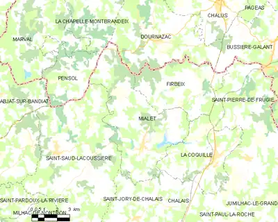 Mialet est limitrophe de huit autres communes dont trois dans le département de la Haute-Vienne. Au sud-est, le territoire de Chalais est limitrophe sur environ 550 mètres.