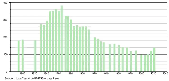 L'évolution du nombre d'habitants est connue à travers les recensements de la population effectués dans la commune depuis 1793. Pour les communes de moins de 10 000 habitants, une enquête de recensement portant sur toute la population est réalisée tous les cinq ans, les populations légales des années intermédiaires étant quant à elles estimées par interpolation ou extrapolation[36]. Pour la commune, le premier recensement exhaustif entrant dans le cadre du nouveau dispositif a été réalisé en 2005[37].