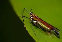 Les femelles sont légèrement plus foncées que les mâles. La tête est, avec le processus céphalique, noire au dessus et vert pâle ou ochracé en dessous. Les yeux sont fuchsia ou brun rougeâtre. Le postclypeus, l'anteclypeus et le dessous du thorax sont noir et blanc. Les ailes antérieures sont hyalines avec une nervation et une strie sur le tiers distal de l'aile ochracée terne ou sombre. Les pattes sont ochracées. Les coxae, les trochanters et la base des fémurs postérieurs sont noirs. Les tibias antérieurs présentent un anneau subapicale proéminent de couleur blanc crème[1].