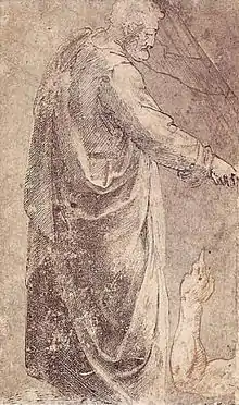 Léonard de Vinci manifeste son intérêt pour David, le copiant dans son propre dessin (bien qu'il ne puisse pas partager la forte musculature de l'œuvre), mais Michel-Ange est également influencé par l'art de Léonard. En 1501, le maître de Vinci expose dans la basilique de la Santissima Annunziata un carton avec Sainte Anne avec la Vierge, l'Enfant et l'agneau (perdu), qui « ne fit pas seulement l'admiration des artistes. Dans la salle où il l'avait achevé, il y eut deux jours durant un défilé d'hommes et de femmes, jeunes et vieux, pour le voir.[69] » Michel-Ange lui-même a vu le carton, et est peut-être impressionné par les nouvelles idées picturales d'enveloppement atmosphérique et d'indétermination spatiale et psychologique ; il est presque certain qu'il l'a étudié, comme le montrent les dessins de ces années, avec des traits plus dynamiques, une plus grande animation des contours et une plus grande attention au problème du lien entre les figures, souvent résolu par des groupes articulés dynamiquement. La question de l'influence de Léonard est un sujet controversé parmi les savants, mais certains d'entre eux en ont lu les traces dans les deux séries de sculptures qu'il exécute dans les années qui suivent immédiatement[70]. Deux des innovations stylistiques de Léonard assumées et faites siennes dans le style de Michel-Ange sont largement reconnues : la construction pyramidale des figures humaines, importante par rapport aux fonds naturels, et le « contrapposto », porté au degré maximum par Michel-Ange, qui rend les personnages dynamiques et dont on voit les membres partir dans des directions spatiales opposées.