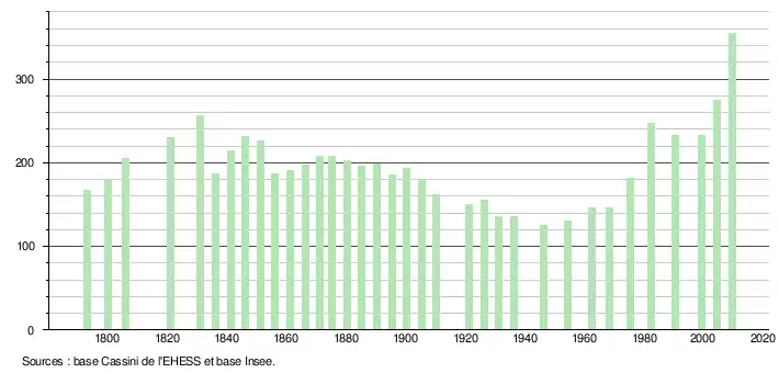 L'évolution du nombre d'habitants est connue à travers les recensements de la population effectués dans la commune depuis 1793. À partir du , les populations légales des communes sont publiées annuellement dans le cadre d'un recensement qui repose désormais sur une collecte d'information annuelle, concernant successivement tous les territoires communaux au cours d'une période de cinq ans. Pour les communes de moins de 10 000 habitants, une enquête de recensement portant sur toute la population est réalisée tous les cinq ans, les populations légales des années intermédiaires étant quant à elles estimées par interpolation ou extrapolation[4]. Pour la commune, le premier recensement exhaustif entrant dans le cadre du nouveau dispositif a été réalisé en 2004[5],[Note 1].