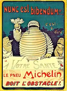 Le personnage est surmonté de la phrase de l'auteur latin Horace « Nunc est bibendum » (« C'est maintenant qu'il faut boire »), transformé par l'auteur en slogan publicitaire : « Le pneu Michelin boit l'obstacle ».