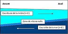 Schéma représentant les courants d’un estuaire où l’eau douce moins dense coule au-dessus de l’eau salée qui remonte vers les terres. Les poulamons cherchent surtout à rester dans la zone de vitesse nulle.