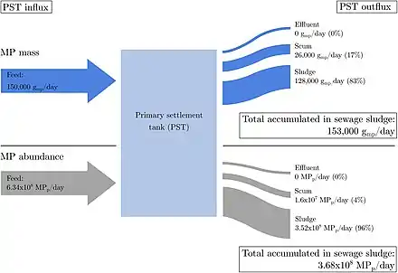 * à gauche : taux et masse de microparticules de plastiques (MP) transitant et sortant de la station d'épuration (PST) de Nash au Royaume-Uni, qui traite les eaux usées de 300 000 Équivalent-habitant ;