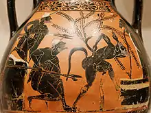À la suite de cet épisode, Ovide rapporte une autre mésaventure du roi phrygien dans laquelle il se voit affublé d'oreilles d'ânes. L'existence de cette légende est déjà évoquée par Aristophane au Ve siècle av. J.-C.[6] et les représentations de Midas avec de telles oreilles sur des stamnos grecs attestent d'une origine plus ancienne encore[7]. Il est d'ailleurs vraisemblable que ce soit cette iconographie qui a motivé les tentatives d'explications chez les auteurs anciens et l'élaboration de récits légendaires qui connaissent plusieurs variantes au fil des siècles. Au tournant de l'ère commune, Conon le Mythographe[8] voyait d'ailleurs déjà dans ces légendes des constructions dérivées de la réputation qu'avait Midas, entretenant une armée d'informateurs pour se prémunir des complots, d'avoir de « grandes oreilles », transformées par la rumeur et au fil des ans en oreilles d'âne[9], initiant une légende dont Ovide livre la version la plus complète qui nous soit parvenue.