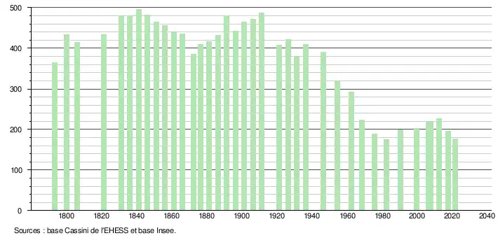 L'évolution du nombre d'habitants est connue à travers les recensements de la population effectués dans la commune depuis 1793. Pour les communes de moins de 10 000 habitants, une enquête de recensement portant sur toute la population est réalisée tous les cinq ans, les populations légales des années intermédiaires étant quant à elles estimées par interpolation ou extrapolation[26]. Pour la commune, le premier recensement exhaustif entrant dans le cadre du nouveau dispositif a été réalisé en 2007[27].