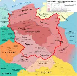 Mieszko décède en 992, laissant à son fils aîné Bolesław, un pays d’environ 250 000 km2 et de 1,2 million d'habitants[7].