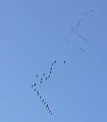 La plupart des oiseaux migrent en groupe (appelé nuée), par espèce, indépendamment du fait qu'ils soient sociaux ou solitaires. Ils forment des formations en chevron. Dans cette approche, l'oiseau en tête doit fournir les efforts les plus importants, les autres oiseaux du groupe ayant à fournir un effort moindre car ils bénéficient de son sillage. Dans cette configuration, les oiseaux se relaient en tête du groupe. On a pu prouver que ce type d'organisation permet une économie d'énergie globale de 23 %[67]. Ces groupes peuvent varier au hasard des haltes. Les Carouges à épaulettes ont la caractéristique de ne voyager qu'en nuée unisexe.