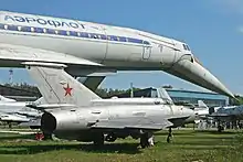 L'un des MiG-21I Analog est exposé au musée central des forces aériennes de la fédération de Russie de Monino, à l'ombre d'un Tupolev-144.